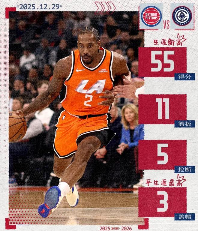 这场比赛发挥最出色的无疑就是伦纳德,全场比赛出战39分钟,投篮26中17命中率65.4%,三分三分10中5命中率50%,罚球17中16,拿到55分11篮板2助攻5抢断3盖帽,真实命中率达到了让人吃惊的92.2%,正负值+20。第三节他单节12中9+三分5中3拿到26分5篮板1抢断1盖帽,要知道第三节活塞全队总共才得到27分,小卡为我们诠释了何为一人打一队,进入状态的战神卡无论是单防还是包夹,全都没用。凭借本场比赛的出色发挥,伦纳德创造了NBA历史第一纪录:据统计,小卡是NBA史上第一位单场至少砍下55分11篮板2助攻5抢断3盖帽,且命中5个三分球的球员。单场55分的得分不仅刷新了个人生涯单场最高得分纪录,同时也追平了快船队史最高得分纪录,不得不说健康且认真打球的小卡真强!